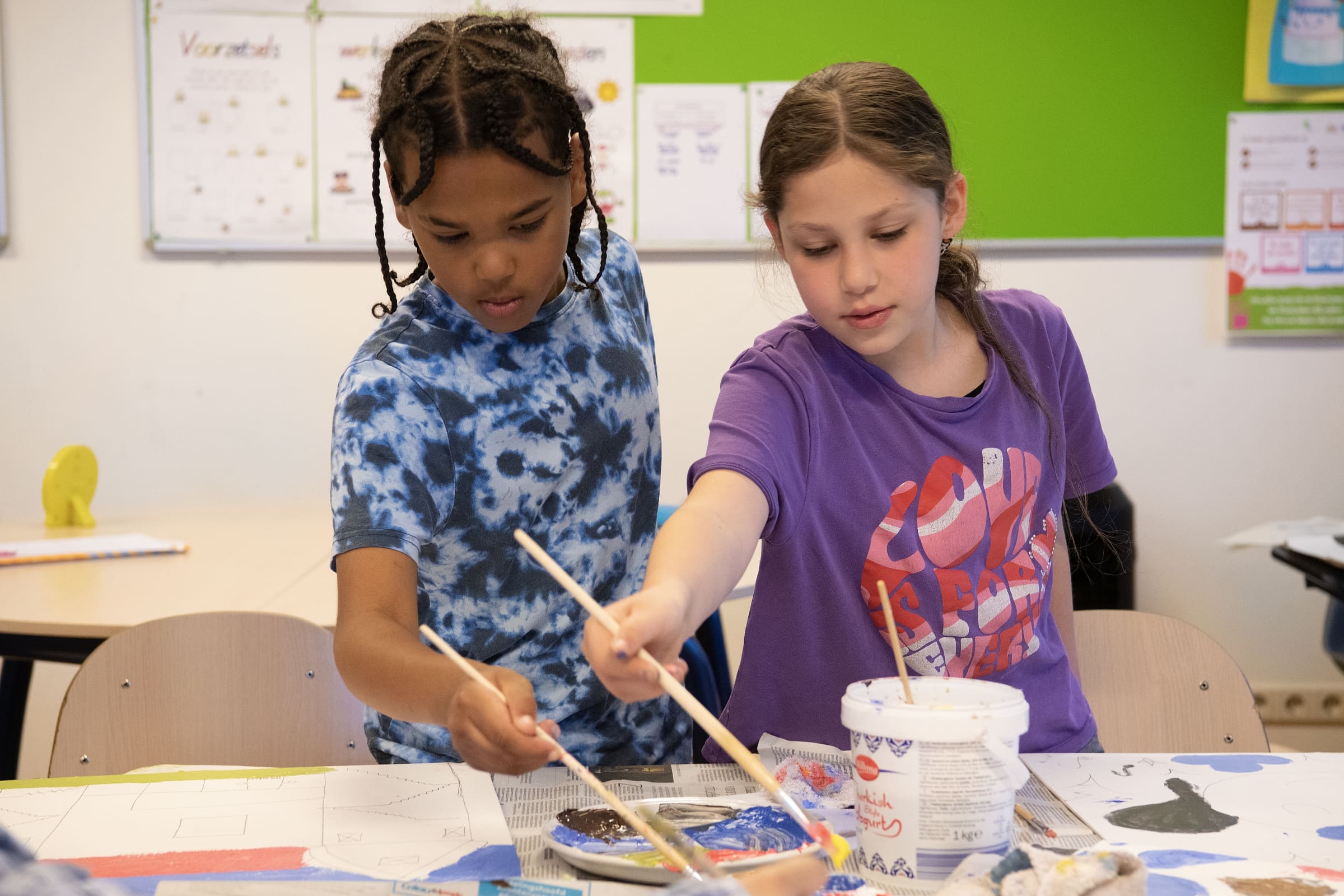 Veel kinderen hebben nog nóóit eerder geschilderd. Het leuke van schilderen is dat je dat juist op je eigen manier mag doen. En dát is dan juist ook weer een beetje ingewikkeld. Bij veel vakken op school is er maar één antwoord mogelijk. En schilderen kan op 100.000 manieren, kijk maar in een museum: precies, of juist met grote penseelstreken. Zo ook straks in ons museum!