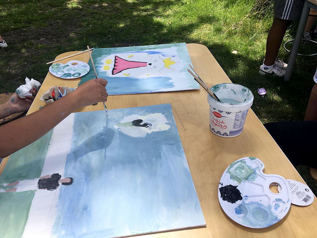 Soms schilderen we buiten, onder de bomen aan grote tafels, soms in de klas en gebruiken we ook het lokaal van een andere groep. Want voor schilderen heb je nou eenmaal ruimte nodig.