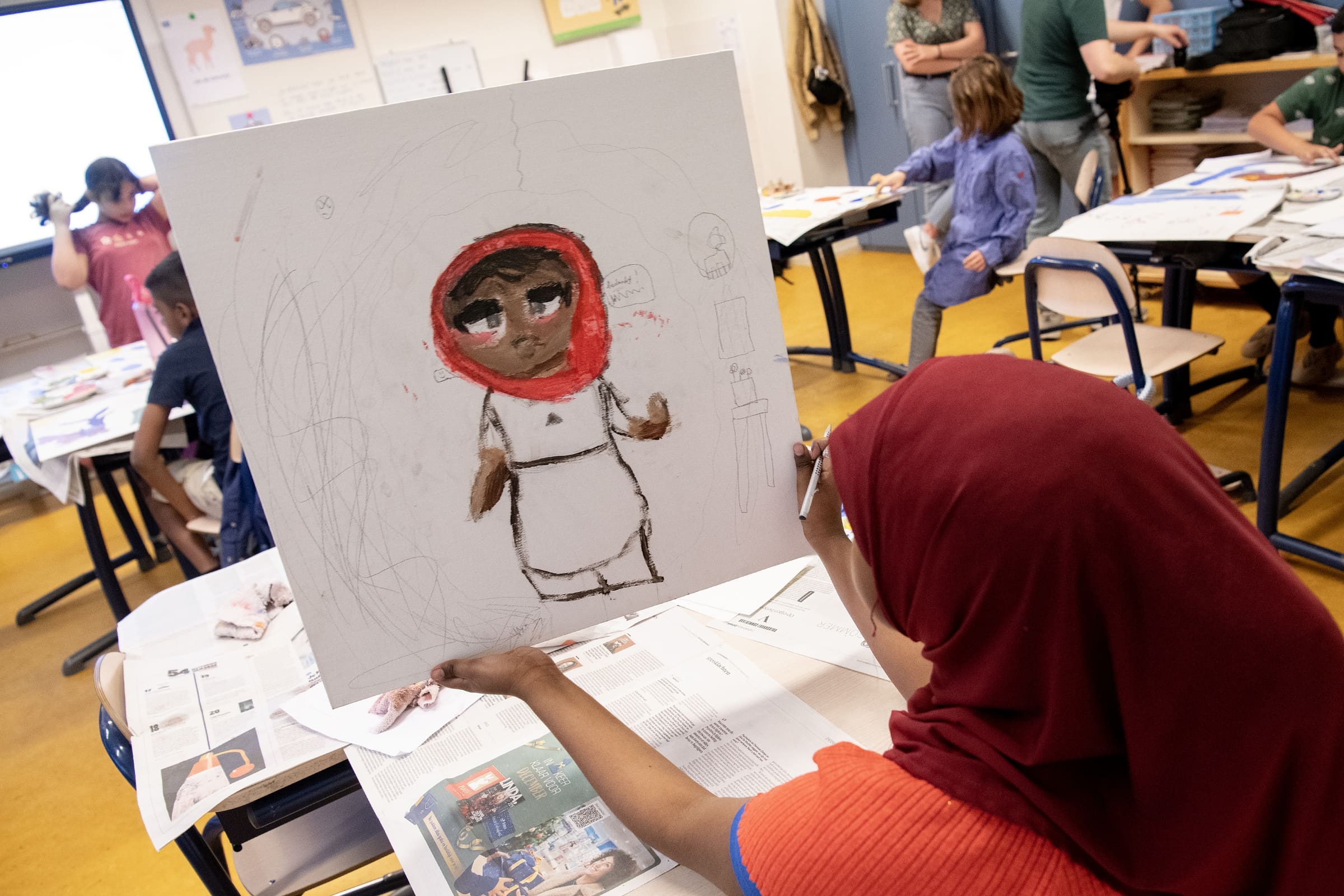 Wat heb je om te schilderen veel spullen nodig! Daarom kom ik al eerder naar de klas om alles klaar te zetten. Op alle tafels leg ik kranten neer en ik vul potten met water. Verder moet ieder groepje verschillende maten penselen en doekjes om je penselen droog te maken. Én natuurlijk de schilderpanelen waar de kinderen op gaan schilderen, dezelfde die kunstenaars ook gebruiken. Deze canvasboards zijn 50 bij 50 centimeter, écht serieus groot dus. Ze passen nog nét op de tafeltjes, ze hadden geen centimeter groter moeten zijn.