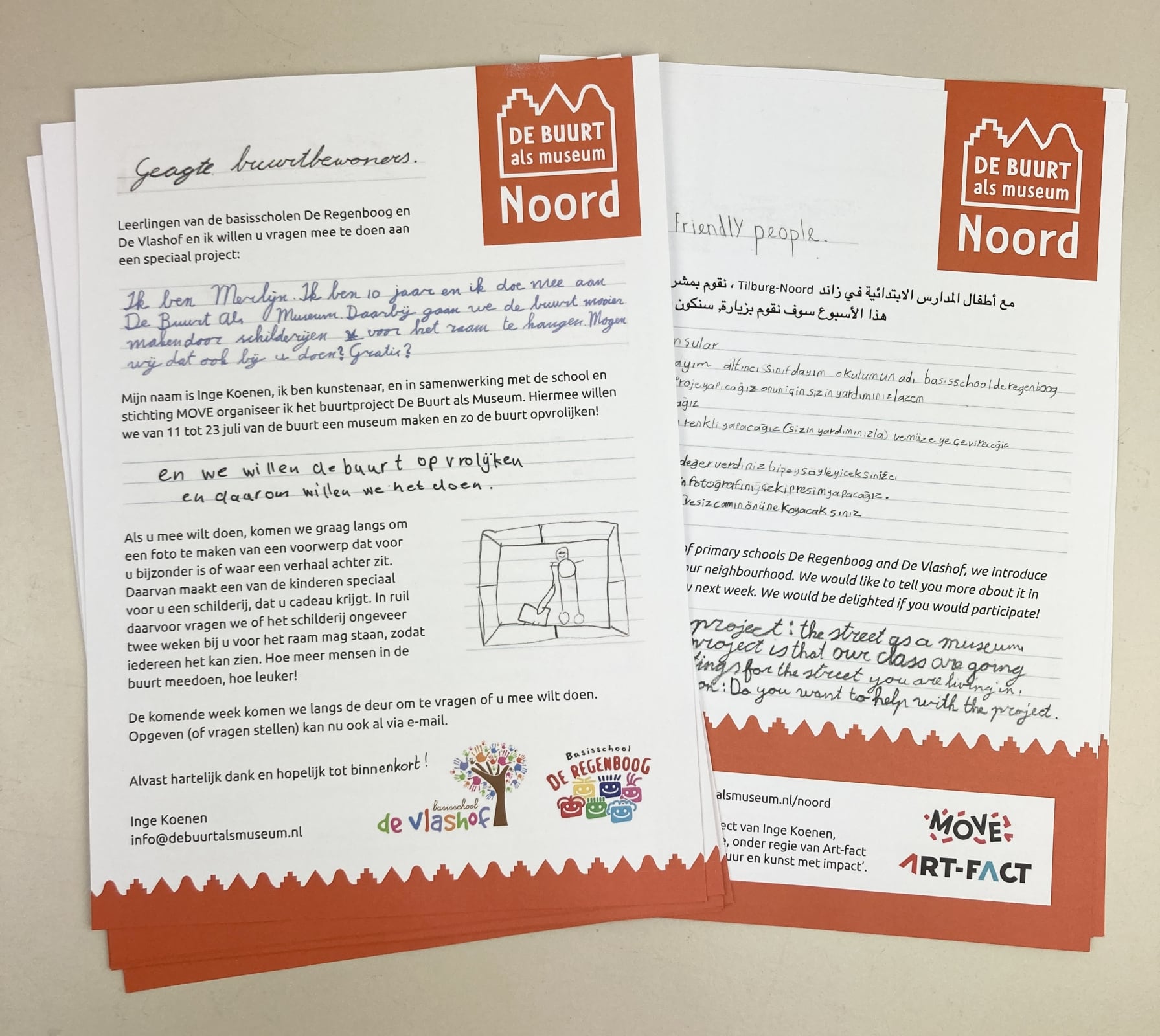 Delen uit deze mooie brieven worden in elkaar geschoven tot één vrolijke, meertalige, uitnodigende brief, die ik volgende week in de buurt ga rond brengen. Dan weten de bewoners dat we er binnenkort aan komen.