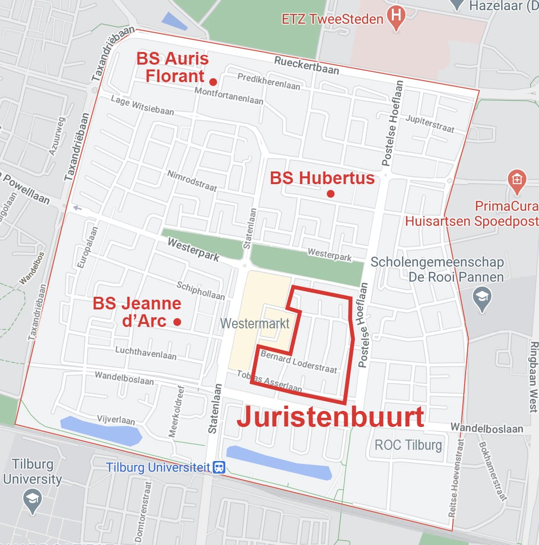Op het kaartje hiernaast kun je zien dat De Buurt als Museum zich afspeelt in de Juristenbuurt, het deel van Het Zand ten oosten van winkelcentrum Westermarkt. Op het kaartje zijn ook de locaties van de drie deelnemende basisscholen aangegeven.