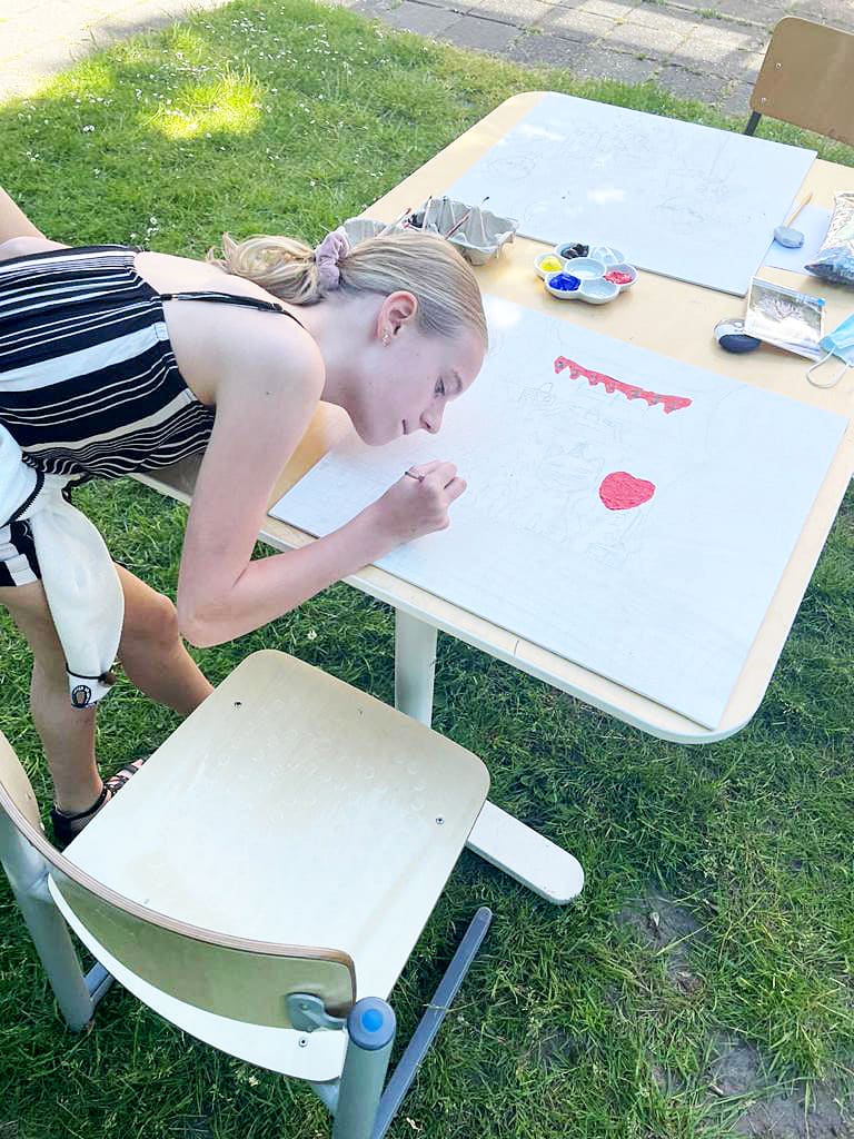 Alle kinderen maken het schilderij later in de klas af. Daarvoor maak ik voor iedere groep een filmpje met aanwijzingen en aanmoedigingen. Soms kom ik ook nog een keer langs. Bij veel kinderen zie ik gaandeweg het zelfvertrouwen groeien.